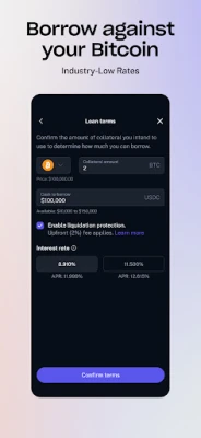 Need liquidity? Borrow against your Bitcoin or Eth at the lowest fixed rate in the industry at 50% LTV (9.999% APR) on 12-month fixed-term loans. There is no pre-payment penalty, and you enjoy self-custody via MPC: your assets stay visible on-chain 24/7 without rehypothecation.